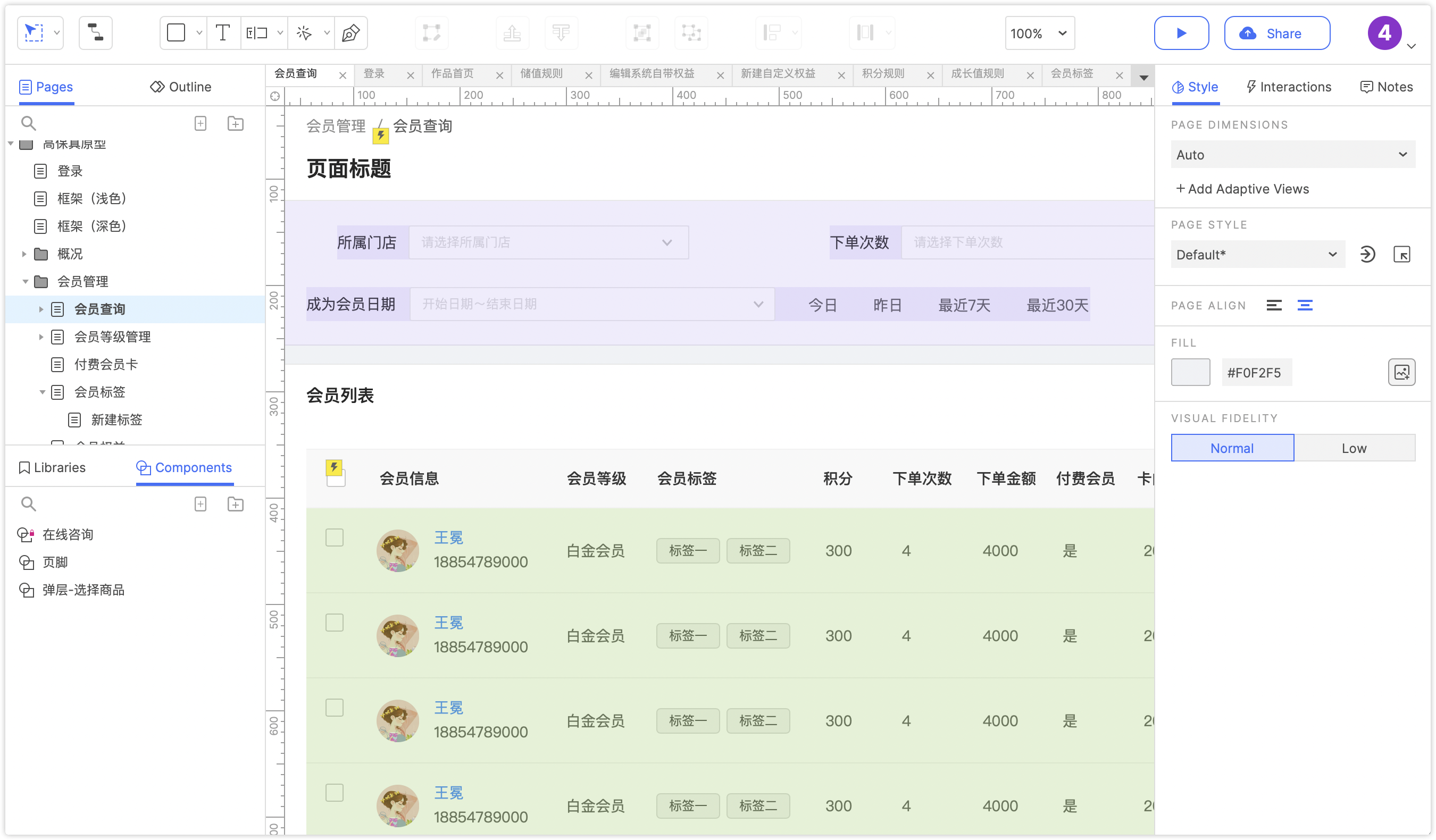 原型设计:支持高保真原型绘制,具备丰富完善的交互能力;