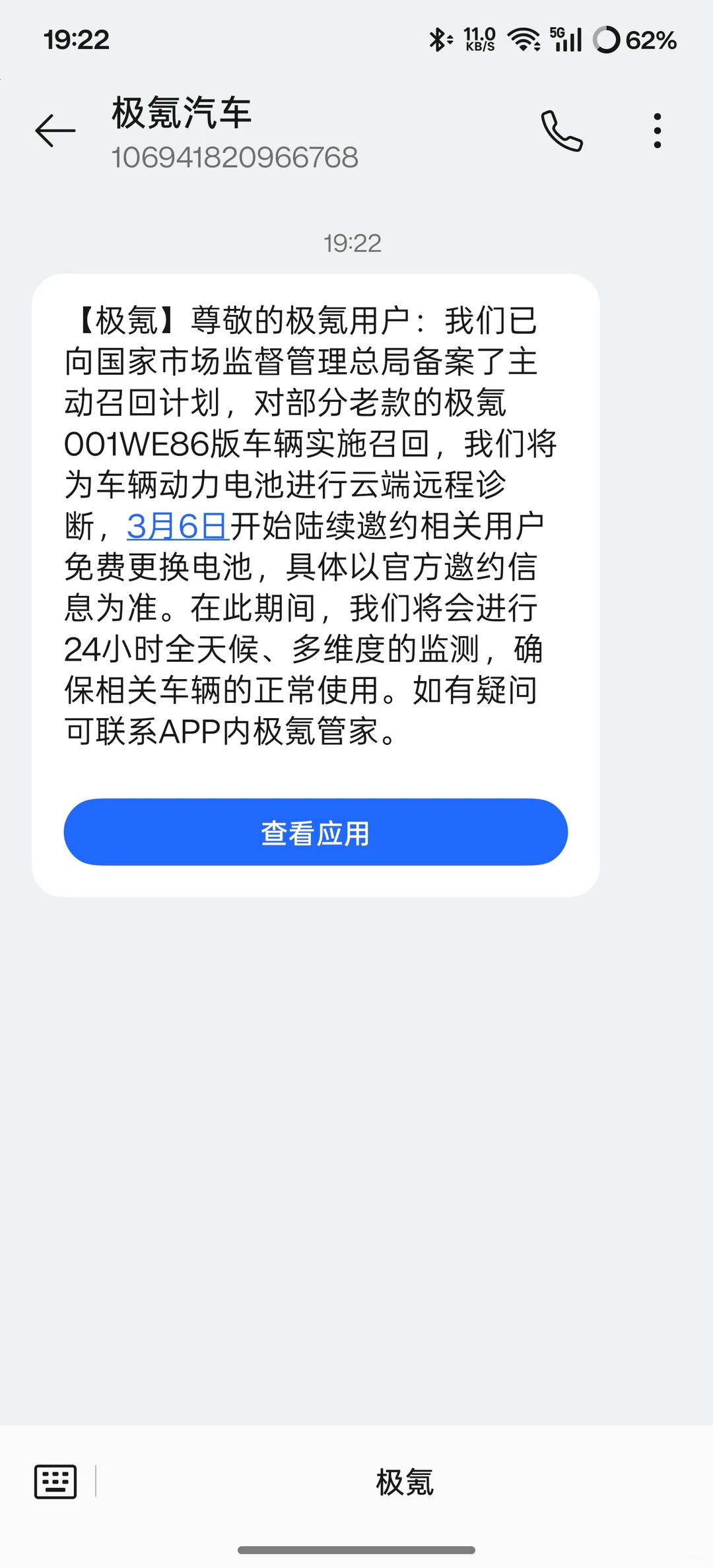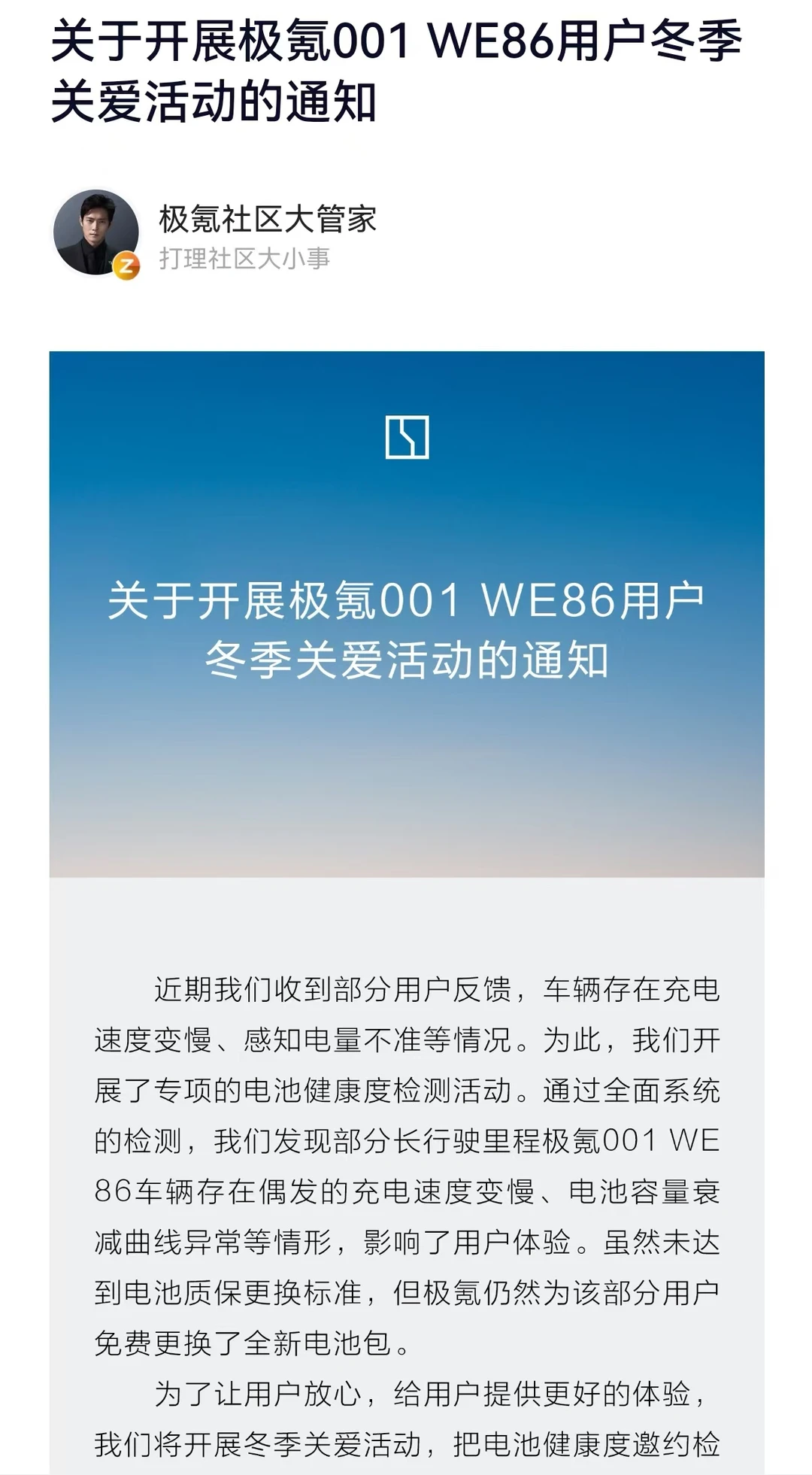 我001开这么久电池好好的,极氪居然主动发信息让回去免费深度检测,有问题直接换电池!