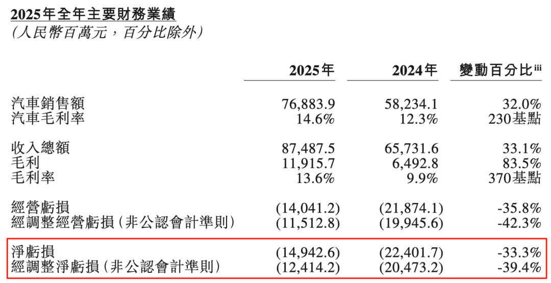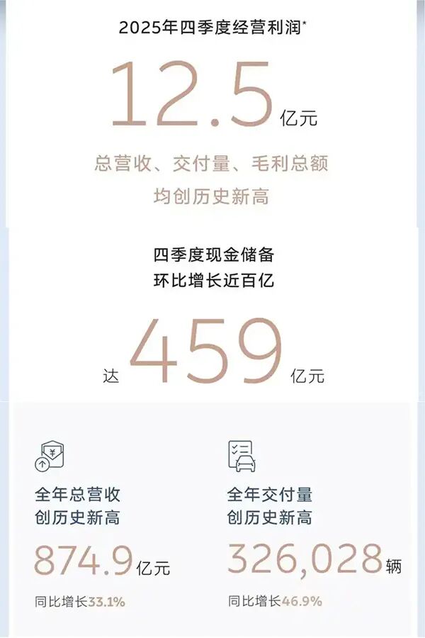 2025年第四季度蔚来经营利润12.5亿元,四季度现金储备459亿元。得益于四季度的表现,2025年蔚来全年总收入874.88亿元,同比增长33.1%。