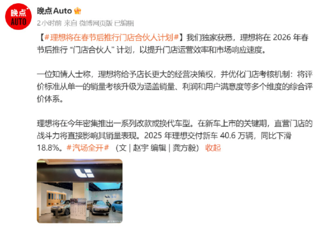 2026年开年,理想对直营体系进行了改革,启动了“门店合伙人计划”,同时关闭部分低效门店,将资源集中在核心商圈。