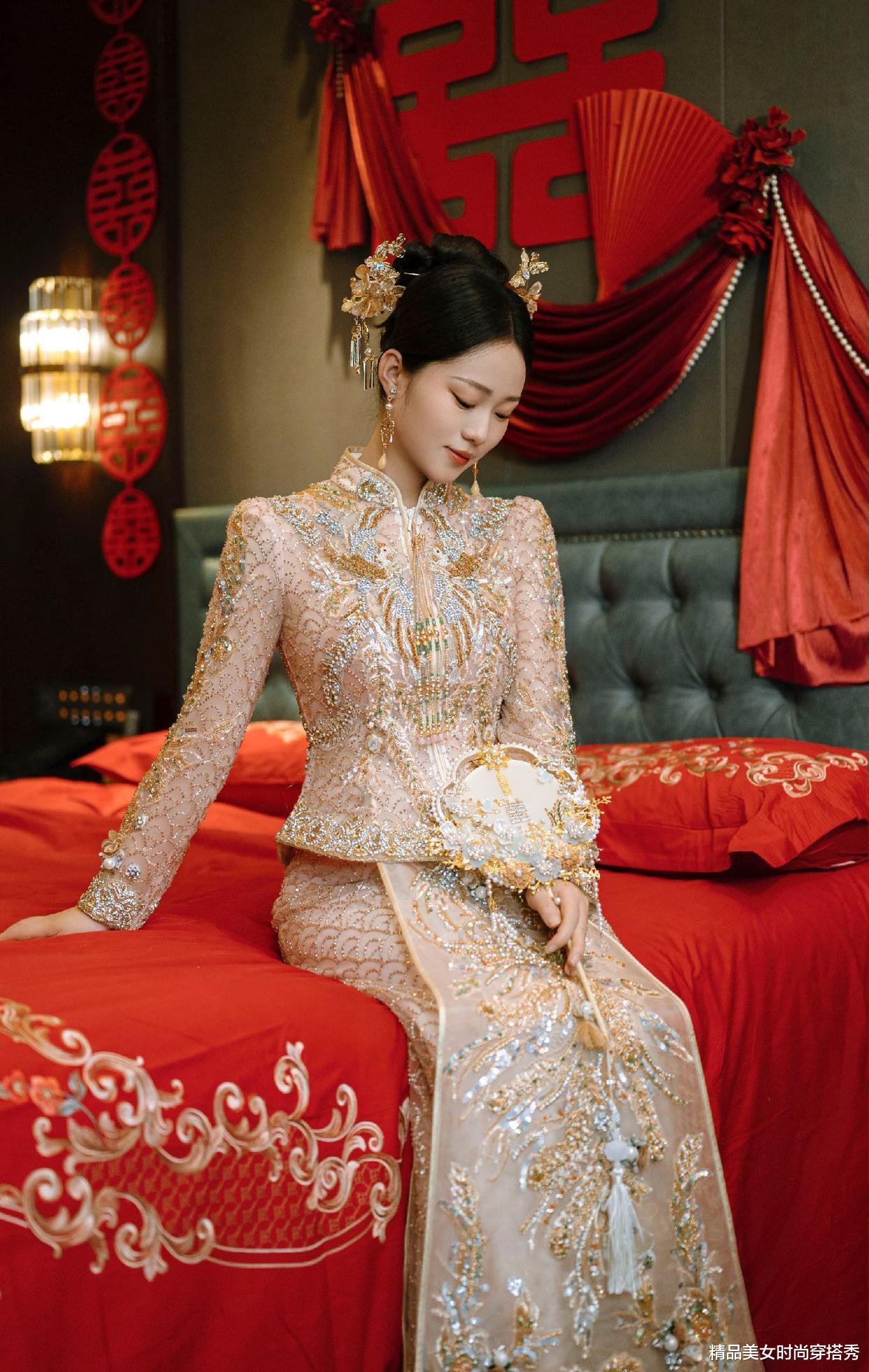 同时,衣服上那些精美的金线刺绣工艺,更是体现了中国古老的传统韵味。设计师巧妙地用这些元素,赋予了礼服别样的神采。穿上这件衣服的你,分分钟都能化身为婚礼的主角。