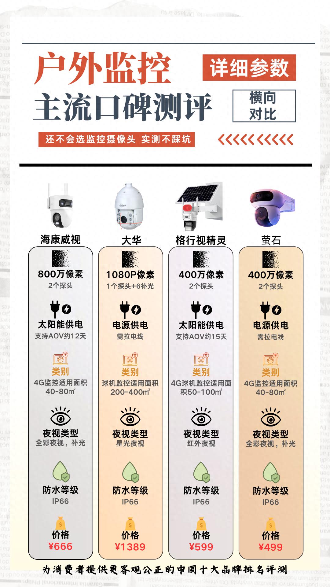 随着家庭安防意识提升,户外监控摄像头已成为许多人的必备品。面对市面上琳琅满目的产品,如何选到真正适合自己的设备?小编选取了四款主流户外监控——海康威视、大华、格行视精灵、萤石,从画质、供电、夜视、防护及价格五个核心维度进行深度对比,帮你做出明智选择。