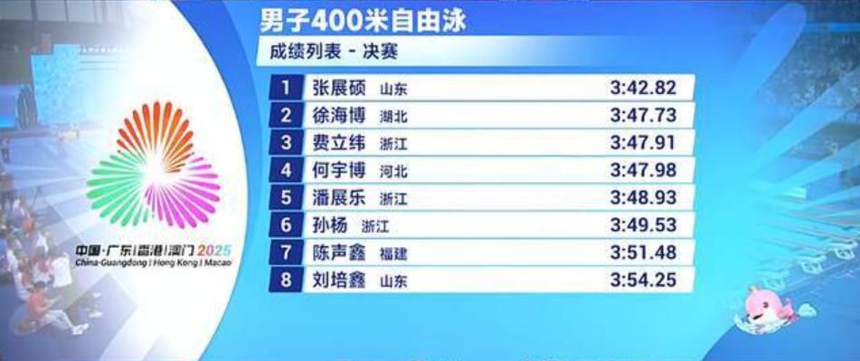 在第十五届全运会游泳首金日,山东小将张展硕以3分42秒82的成绩勇夺男子400米自由泳冠军,这一成绩不仅刷新世界青年纪录,更位列中国历史第三,仅次于孙杨与张琳的传奇纪录!决赛排名中,徐海博、费立纬分获银铜,而奥运冠军潘展乐与老将孙杨分别以第五、第六名完赛,一场新老对话的泳坛大戏就此落幕。