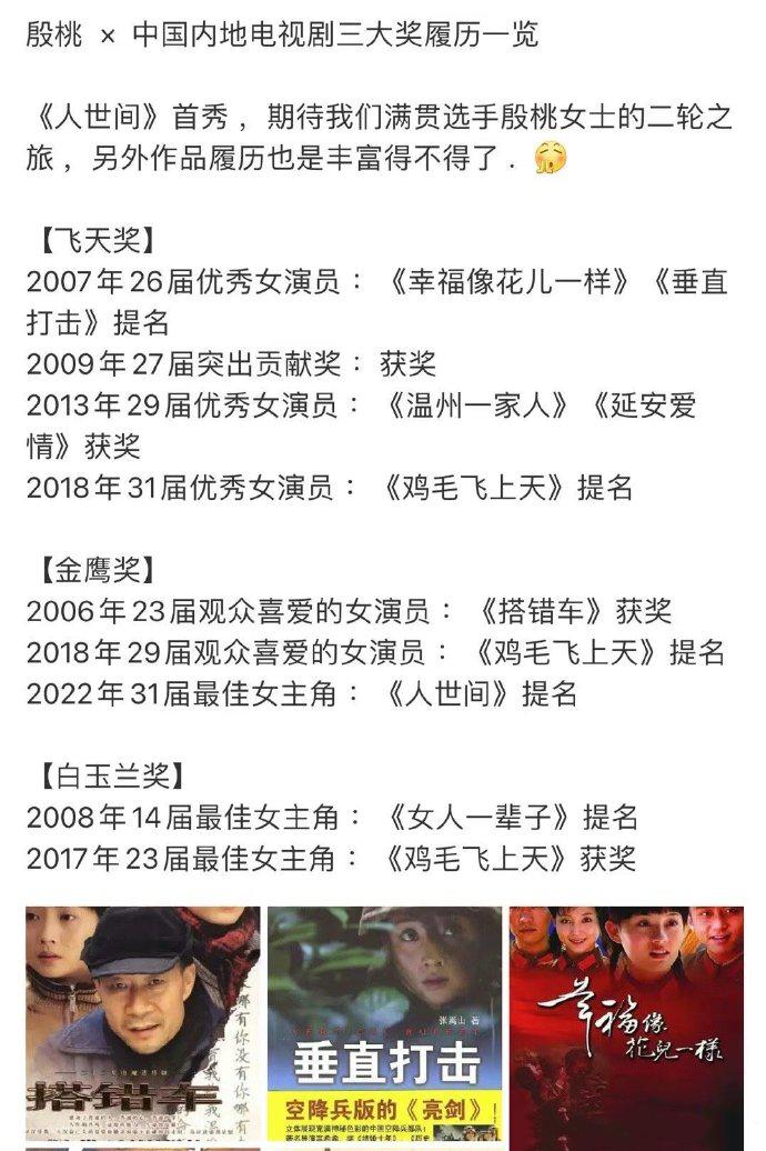 关于殷桃凭借《人世间》的郑娟拿了金鹰奖最佳女主角,我看到最好的一句评论是:不是殷桃需要金鹰证明演技,而是金鹰需要殷桃挽救口碑。 没错,这个奖对殷桃来说真的不算什么,她早在06年就靠《搭错车》拿过了。到17年她已经把飞天,金鹰,白玉兰三大奖都拿全了。 只是在18年的时候,她虽然靠《鸡毛飞上天》获得了提名,但是却被迪丽热巴的《漂亮的李慧珍》打败了没有能够获奖。金鹰节也因此失去公信力,被大家嘲笑成是水奖至今。 如今殷桃获奖,也算是还了她一个公道吧,只是以前水漫金山的那几届占了大便宜,等时间久了不知道还以为她们跟殷桃一个水平了。