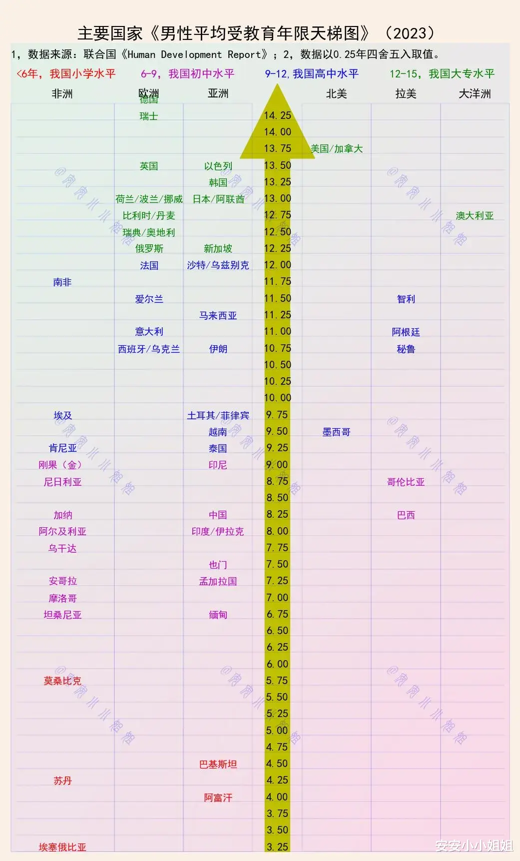 基于联合国《人类发展报告2025》的数据,一张名为《主要国家男性平均受教育年限天梯图(2023)》的图表,为我们提供了超越感性认知、基于全球比较的客观答案。