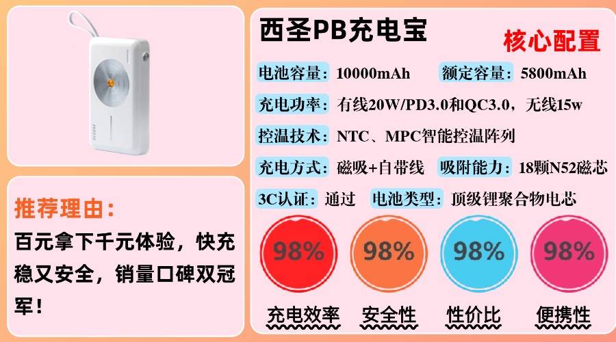 点评:许多充电宝存在低价恶性竞争的情况,外观过度包装,虚标容量、输出功率等参数造假,还堆砌一些华而不实的功能,这不仅可能导致充电宝本身性能不佳,无法稳定充电,还可能因劣质电芯等问题带来起火、爆炸等安全风险。所以强烈推荐近期很是火爆的百元价位轻奢品牌——西圣。它家是百元价位中的安全性能王者,真正意义上做到了安全快充、不伤机两手抓!