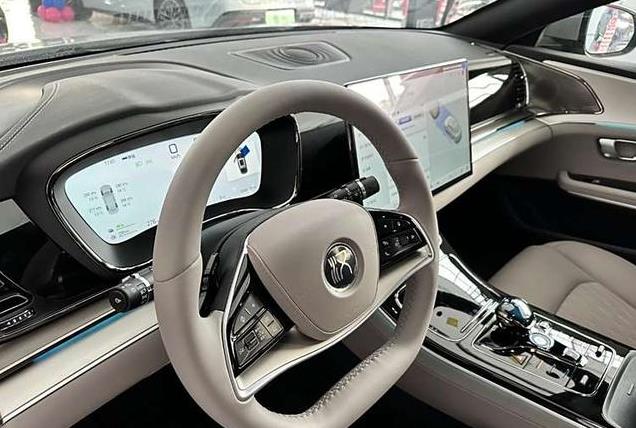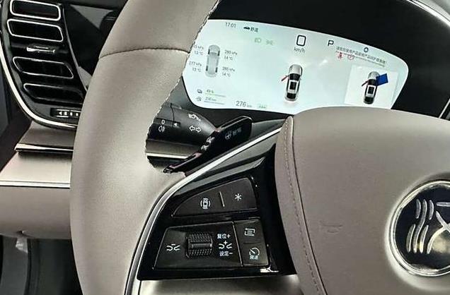 比亚迪汉DM-i智驾版的内饰处理的高级得体,中控台的布局合理,大部分区域采用的是软质和皮质材料包裹,细节处还装饰了高亮的黑色饰条来提升质感,两幅式多功能方向盘造型圆润,并且新增了“智驾”拨片,12.3英寸液晶仪表盘和15.6英寸中控屏相呼应,中控屏内置的是智能座舱高阶版-DiLink 100,拥有3D控车、地图&导航双桌面、语音连续对话等功能。操控台区域的布局合理,电子换挡杆的造型圆润,周边配备了整齐的物理按键,同时还配备了50W无线充电的模块。