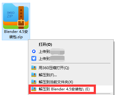 安装步骤:1、得到压缩包之后,鼠标右键解压,点击【解压到Blender 4.5安装包】。