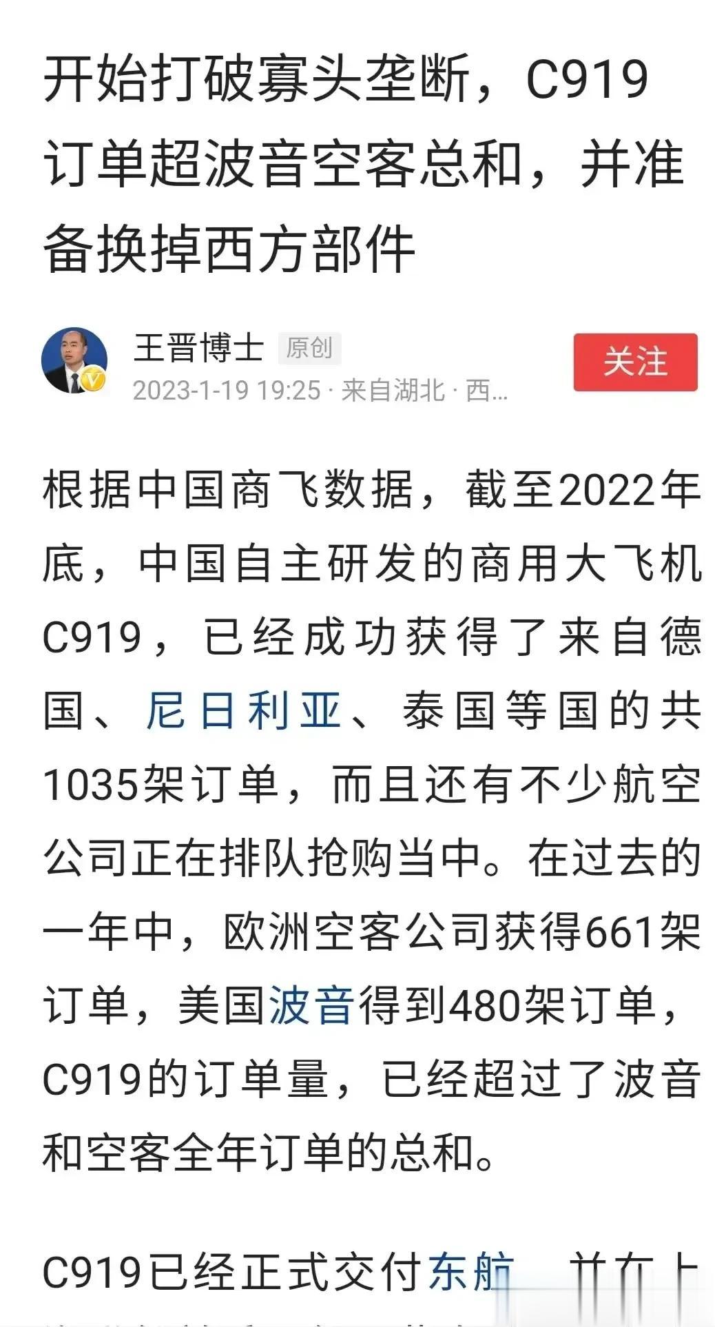 今天回看王晋博士写的C919飞机订单超波音+空客总和,那时我就怀疑这报道的真实性,这还在试飞就超两大航空巨头了。这还没做大就自己把自己给吹上了天。