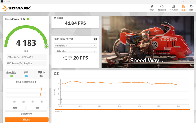 显卡部分的实际测试我们首先进行了3D Mark中的一系列测试,其中在3DMark测试综合性能的Speed Way测试中,总成绩为4183,其中显卡测试成绩为41.84FPS。而且这款显卡用上了最新的Blackwell架构,是专为游戏玩家和创作者打造的制胜平台,它引入了神经网络渲染技术,在游戏和AI表现上会有着显著提升。