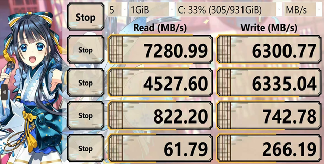 而且它还支持NVMe1.4协议,同时配合智能动态SLC缓存和HMB内存缓冲技术,实测读取速度7280MB/s,顺序写入速度6300MB/s,速度还是可以的;
