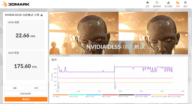 在3Dmark NVIDIA DLSS功能测试中,关闭DLSS 4时帧数为22.6FPS左右,开启DLSS 4 2x之后帧数上升为95.8FPS,开启DLSS 4 4x之后帧数上升为175.6FPS。
