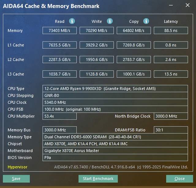 我们也是在不同的频率下进行了实际AIDA64的测试,可以看到在开启EXPO之后有无技嘉D5内存黑科技加持的区别还是非常明显的,尤其是同为6000MHz频率状态下,未开启技嘉D5黑科技时候,AIDA64 显示的内存时序为 28-40-40-84 CR1,此时: