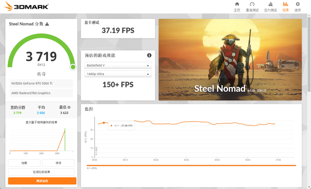在3Dmark中测试可靠性、稳定性和持续性能的Steel Nomad测试中,总成绩为3719,其中显卡测试成绩为37.19FPS。
