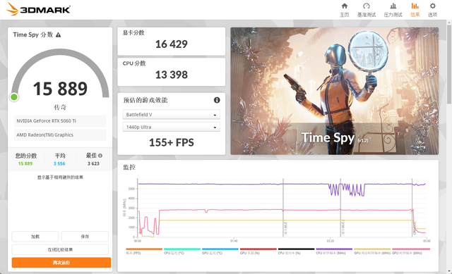 在3DMark的Time Spy(DX12+2K渲染分辨率)测试中,总成绩为15889,其中显卡分数为16429。