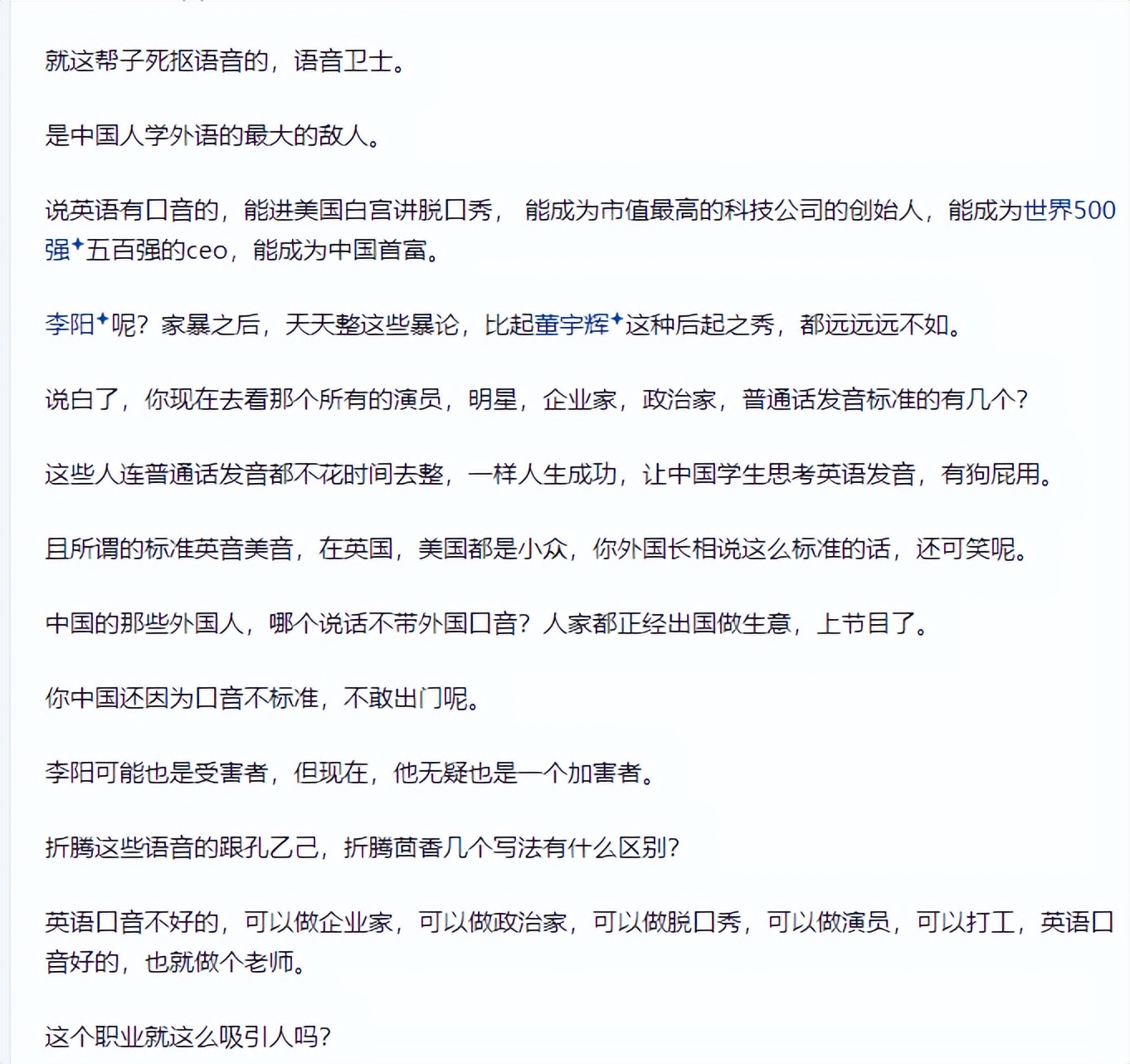 比如这次,在11月8日至9日的疯狂英语线下活动中,李阳竟然批评董宇辉和新东方。还被自己的学员录下来发到了网上。而他的言论让不少网友都表示了反对。李阳说:“我听董宇辉跟国外的外交官交流,几乎每一句话都有严重的语法错误,而且发音特别怪。”