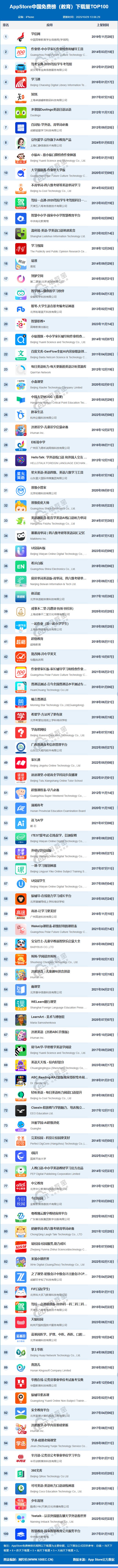排在21-30 名的依次为:小猿搜题、百度文库、每日英语听力、小盒课堂、中国大学MOOC、胖乖生活、洪恩识字、E听说中学、Hello Talk、星火英语;