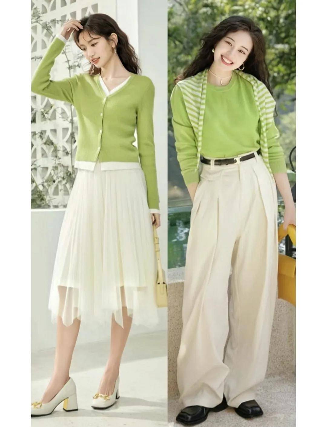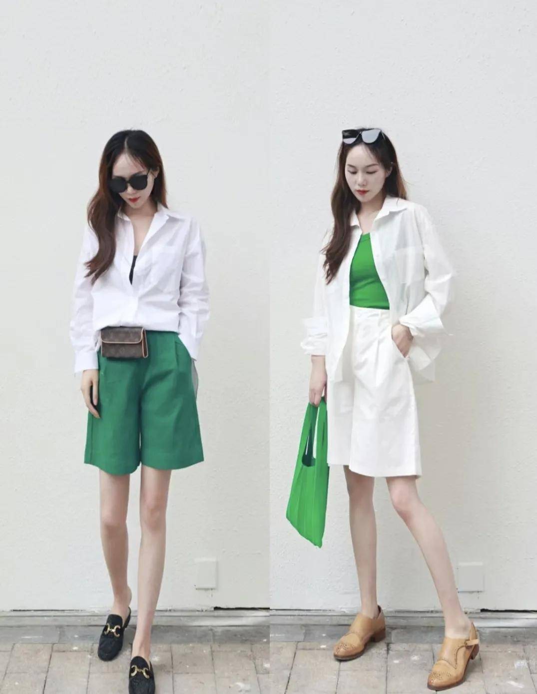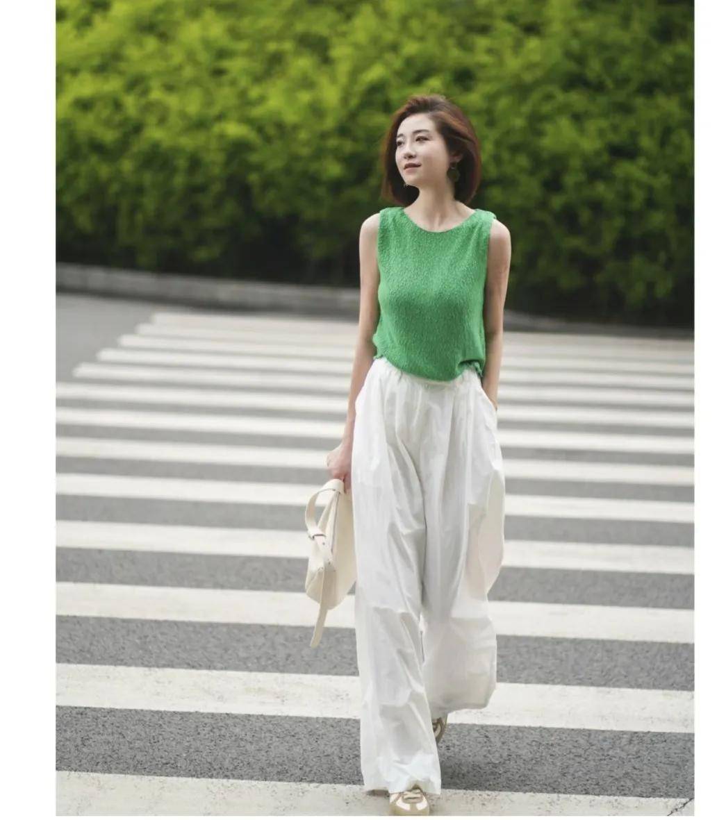 牛油果绿的衬衫搭配白色裤子,高级,元气显白,很洋气的配色。