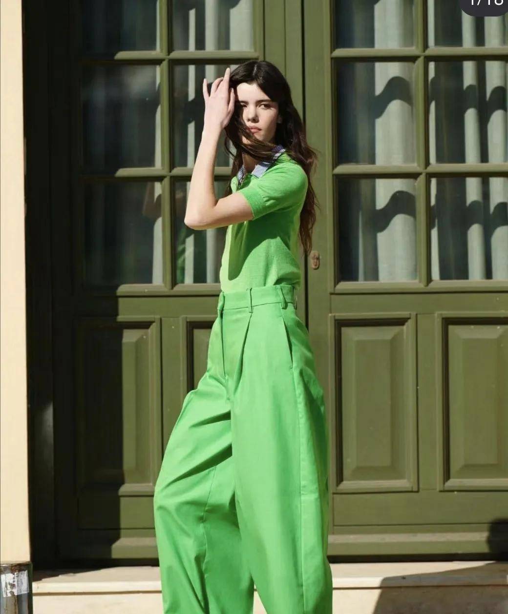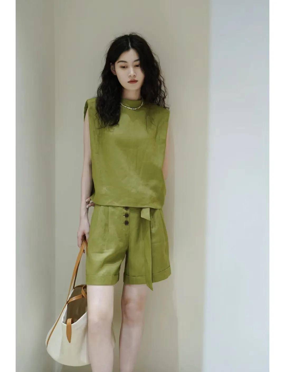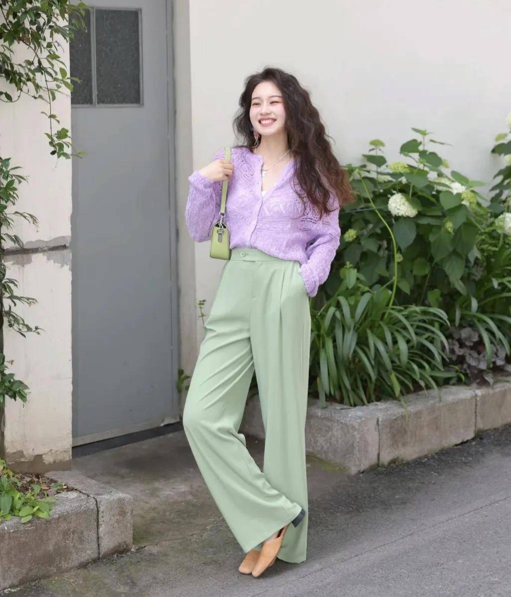 牛油果绿的衬衫搭配白色裤子,高级,元气显白,很洋气的配色。