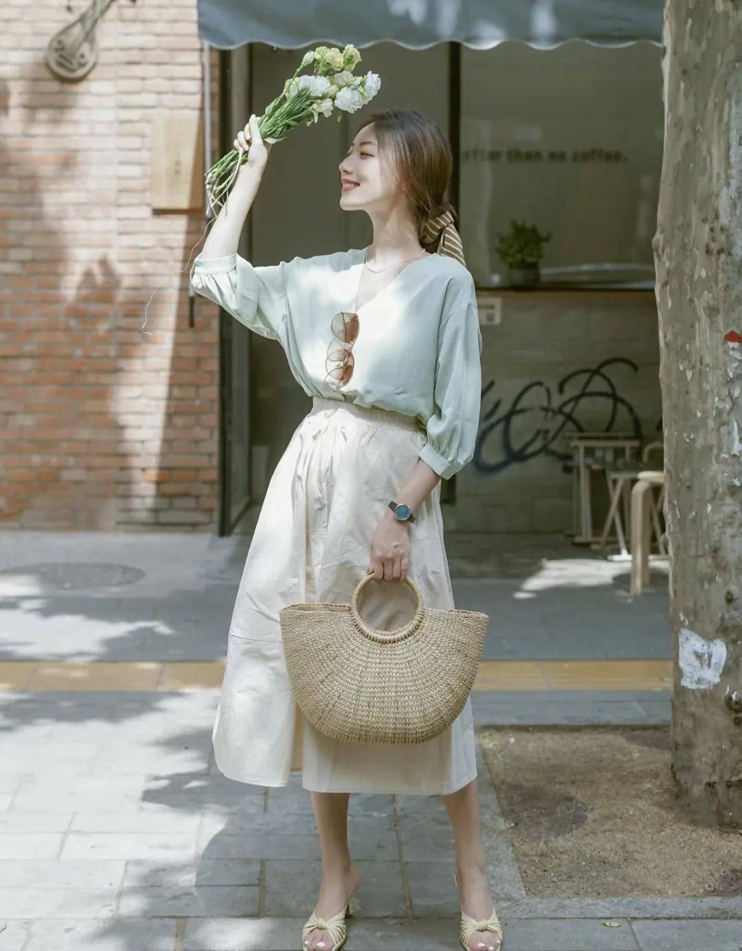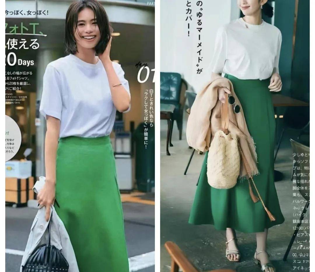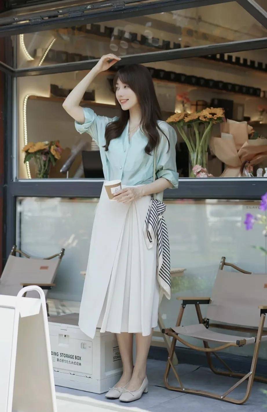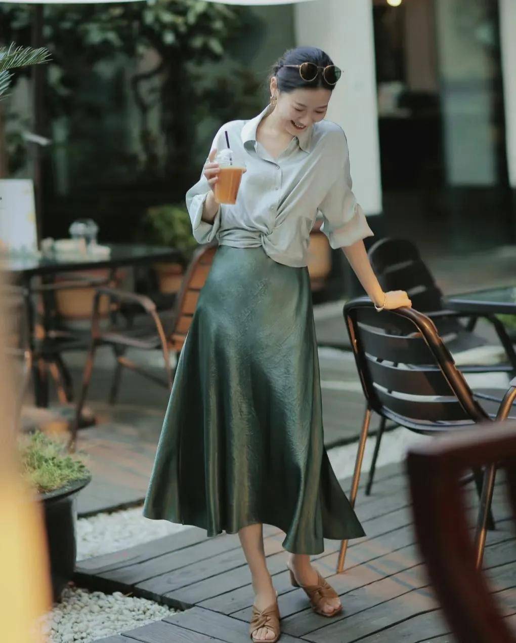 薄荷绿的衬衫搭配墨绿色的鱼尾裙,高级又诱人,气质通勤中又显得优雅知性大方。