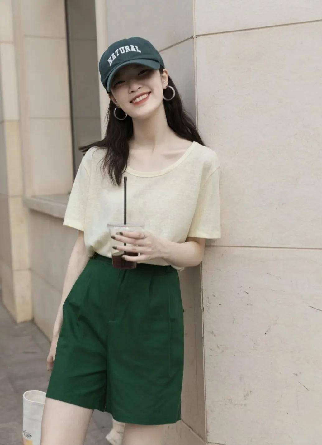 搭配一件浅黄色的T恤,用墨绿色的帽子和短裤相呼应,青春有活力,显得时尚又年轻漂亮。