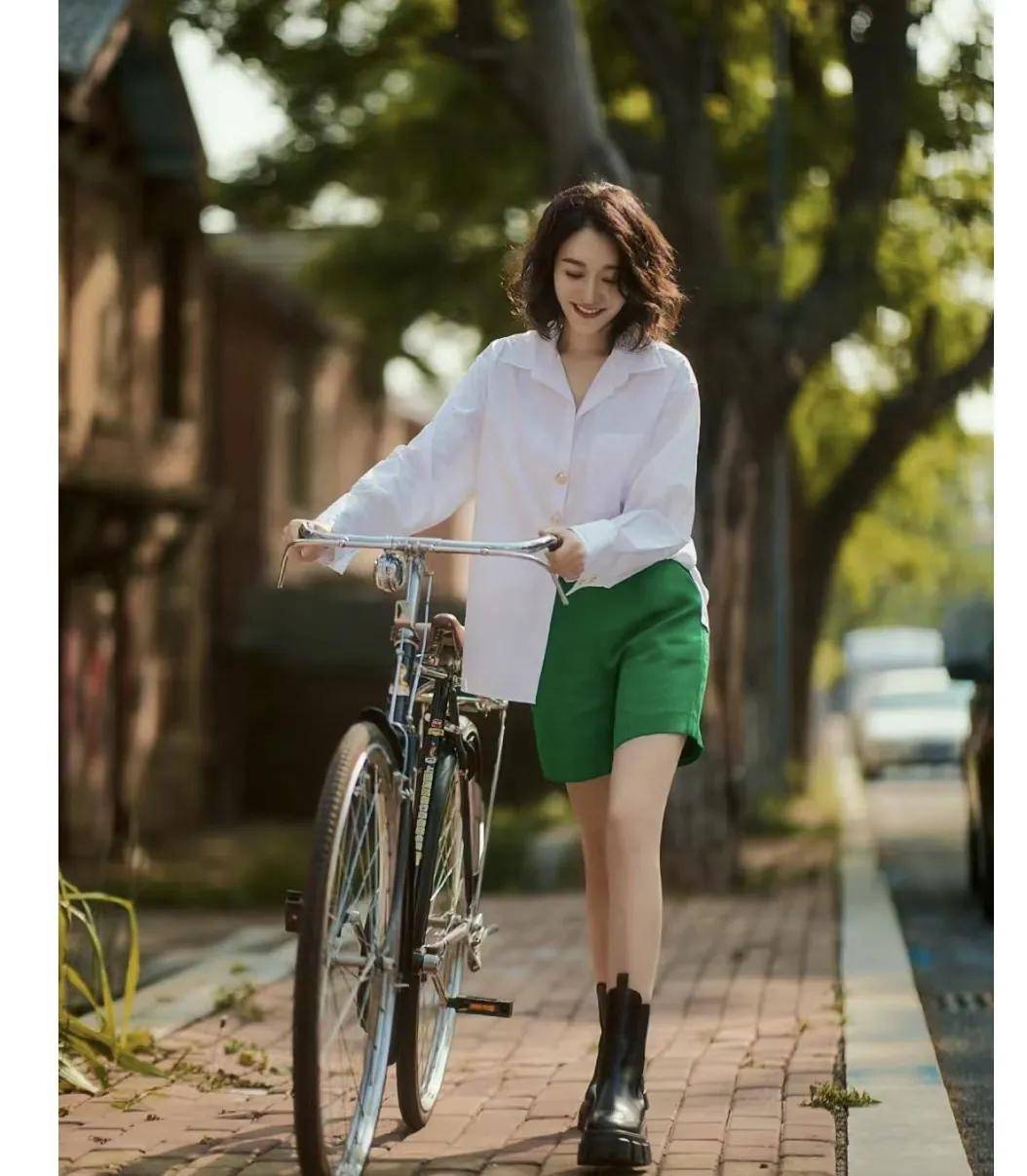 草绿色的短裤搭配白色衬衫,清新淡雅,搭配一双黑色的短靴,宁静中带有一份酷酷的感觉,非常有个性。这种“上白下绿”搭配方式,适合任何一种肤色。