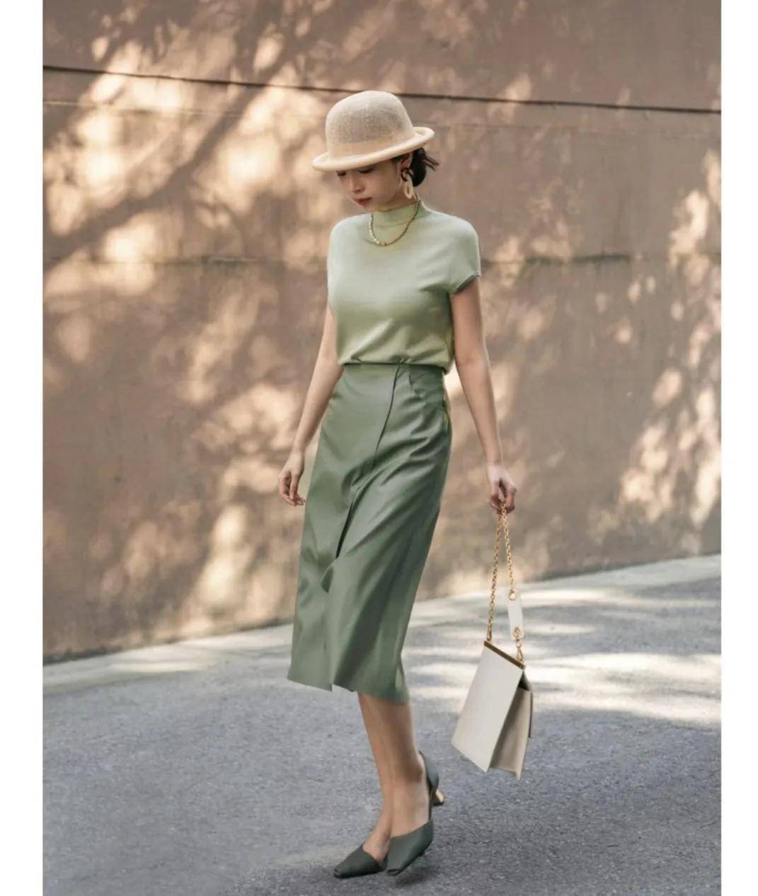 草绿色搭配卡其色半身裙,搭配一双黑色乐福鞋,用黑色包包呼应鞋子,整体和谐又自然,适合暖色调肤色的宝子搭配哦。