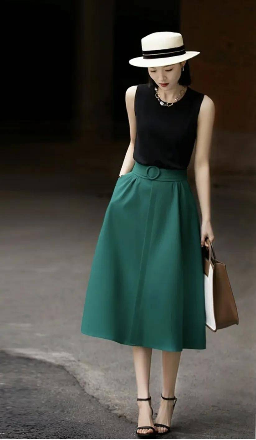 一件黑色的上衣,搭配墨绿色的半身裙,搭配一双黑色的高跟凉鞋或一款米色或者卡其色的手包,就会显得非常的优雅有魅力。