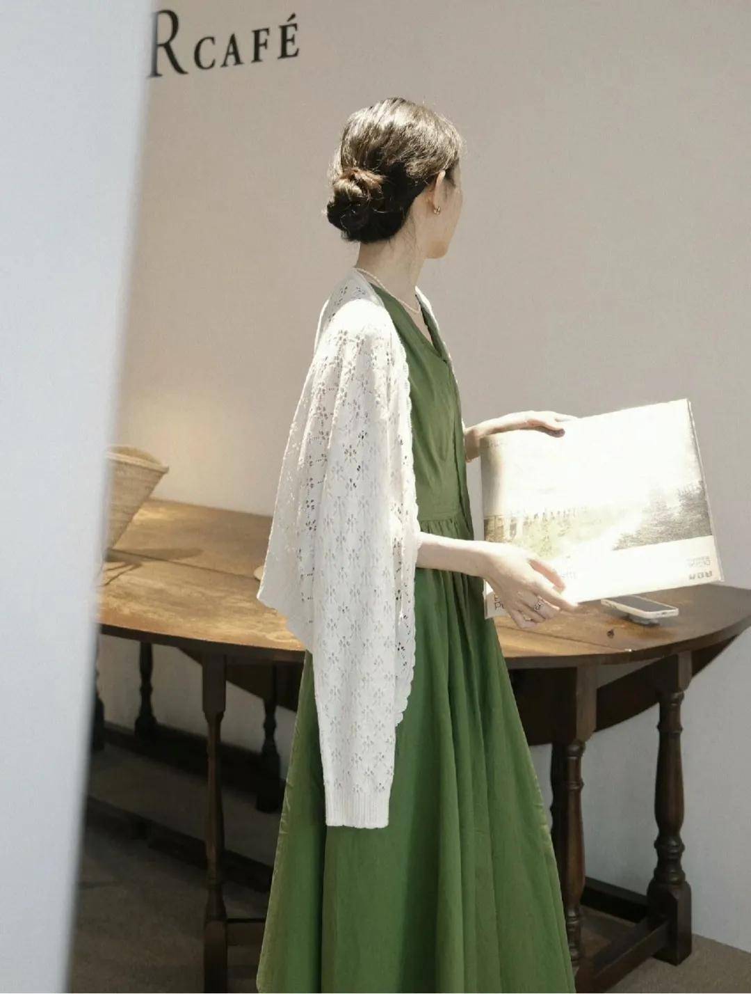 薄荷绿的披肩搭配黑色的连衣裙,仿佛是黑色世界里的一抹阳光,打破了黑色的沉闷,显得灵动又有力量感。