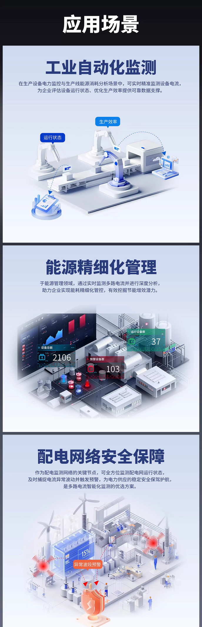采集进线回路、出线回路、变压器回路的电流数据,配合电力监控系统实现能耗统计、三相不平衡监测、故障溯源;