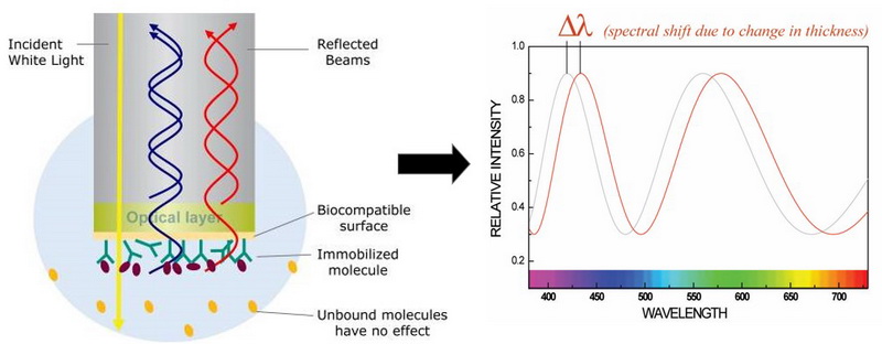 光干涉产生位移:一束光通过传感器的生物膜层时,会同时发生透射和反射,两束光交汇形成干涉光波。生物膜厚度的微小变化,会直接导致干涉光波的相对位移。