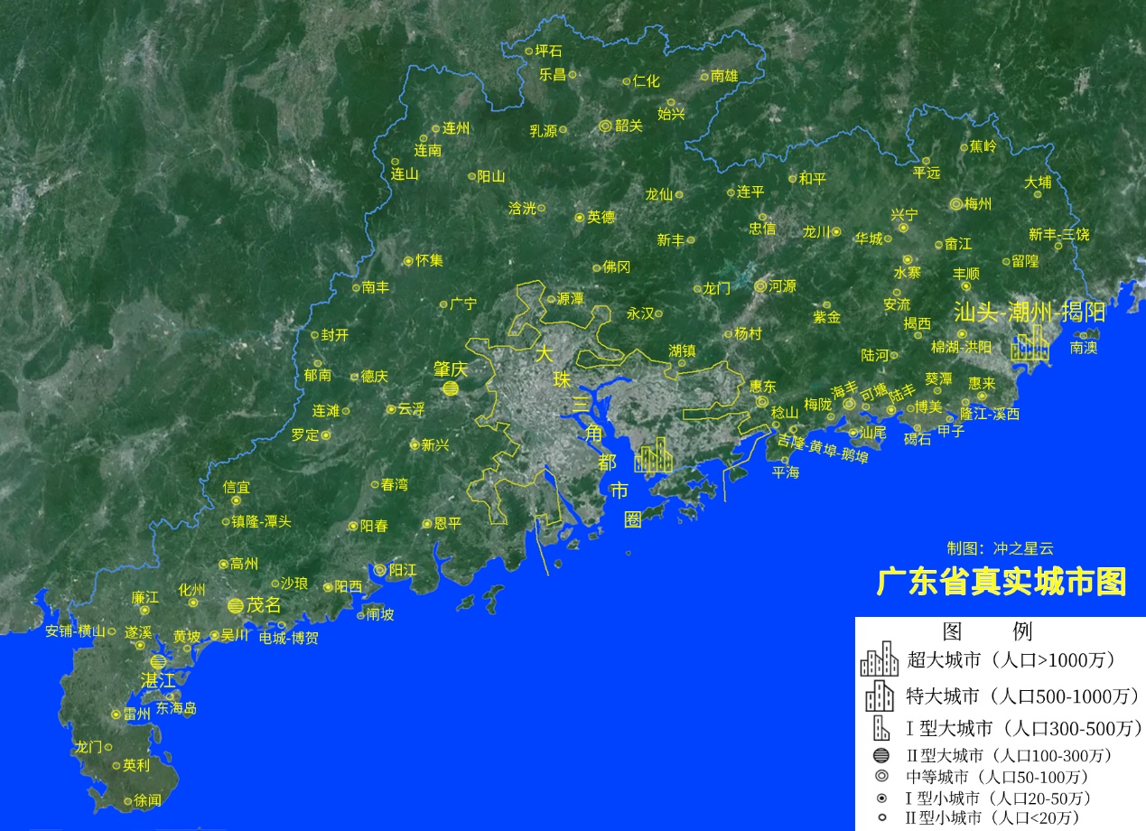 本篇主要列出广东省内,大珠三角都市圈以外的真实城市情况。不过,因为珠三角除港澳外全部在广东境内,所以将其整体算成广东的一座超大城市。关于大珠三角都市圈的范围及组成,本篇不再体现,请参阅珠三角篇: