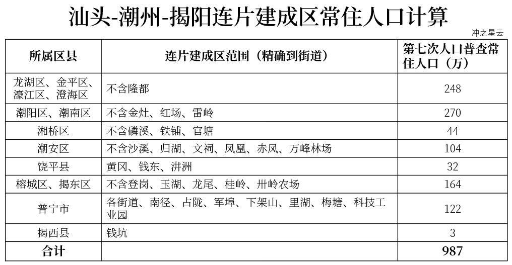 最后,计算一下超大城市汕头-潮州-揭阳组合体的连片建成区人口规模。2020年第七次人口普查时,汕潮揭都市圈连片建成区的人口规模已达987万。而近些年潮汕地区常住人口仍能暂时维持增长,故至今为止,汕潮揭都市圈连片建成区人口应已超过1000万,可作为超大城市处理。