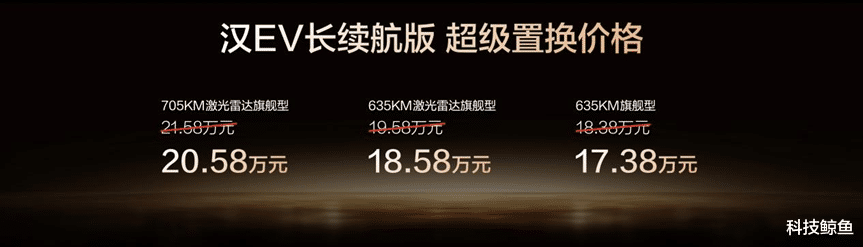 汉 EV 长续航版:提供 3 款配置车型,补贴后售价为 17.38 万 - 20.58 万元。