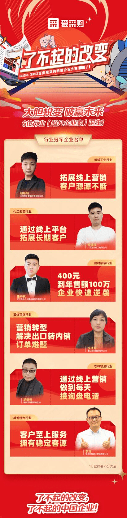 自开赛以来,百度爱采购陆续收到1000多家企业积极报名,大赛围绕机械工业、化工能源、家装建材、服饰百货、农林牧渔、综合行业6大领域,历经了不起的新星-海选、了不起的挑战-初赛、了不起的成就-复赛、了不起的对决-决赛4轮评选,最终角逐出6位超凡企业家,一路走来,见证了中国企业数字化发展的决心与热血。