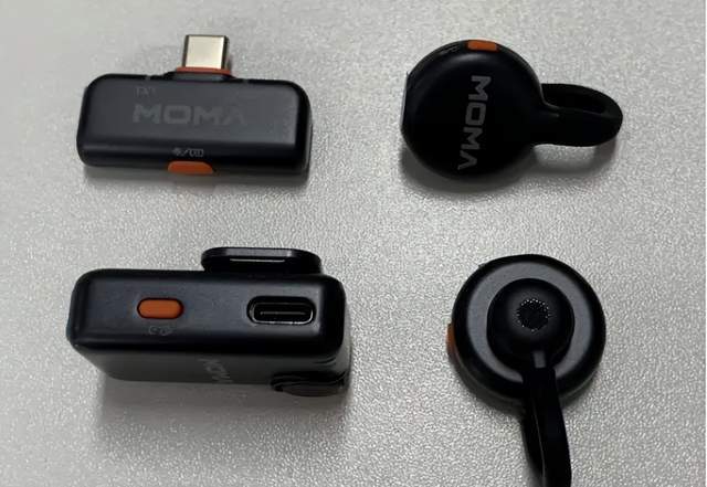 在外观设计方面,体积小巧轻便,使用便携。接收器采用USB-C接口,与手机、平板、笔记本等移动设备即插即用,仅6.3g的重量,使用无负担;发射器设计有一体式领夹,重量仅11.5g,能够轻盈的与衣服固定,不会坠衣领。