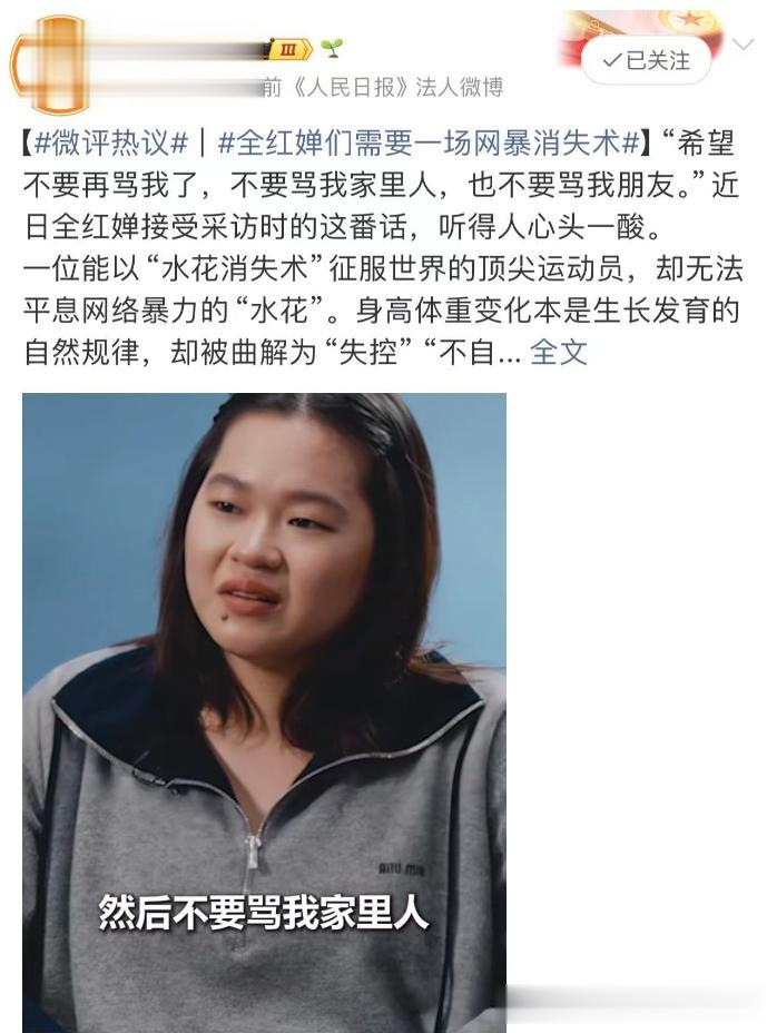这13个字,没有华丽的辞藻,却字字千钧,既点出了全红婵所遭遇的网暴困境,也道出了所有被网暴困扰的运动员的心声。