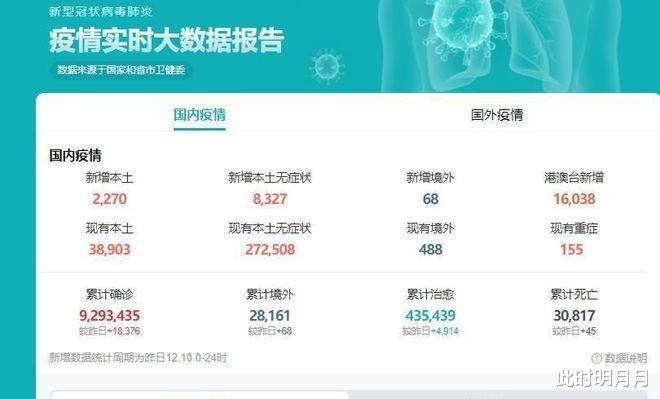 根据12月21号的疫情数据汇总显示,目前确诊病例已经达到9293435人,无症状感染者272508人,累计死亡人数30796人。