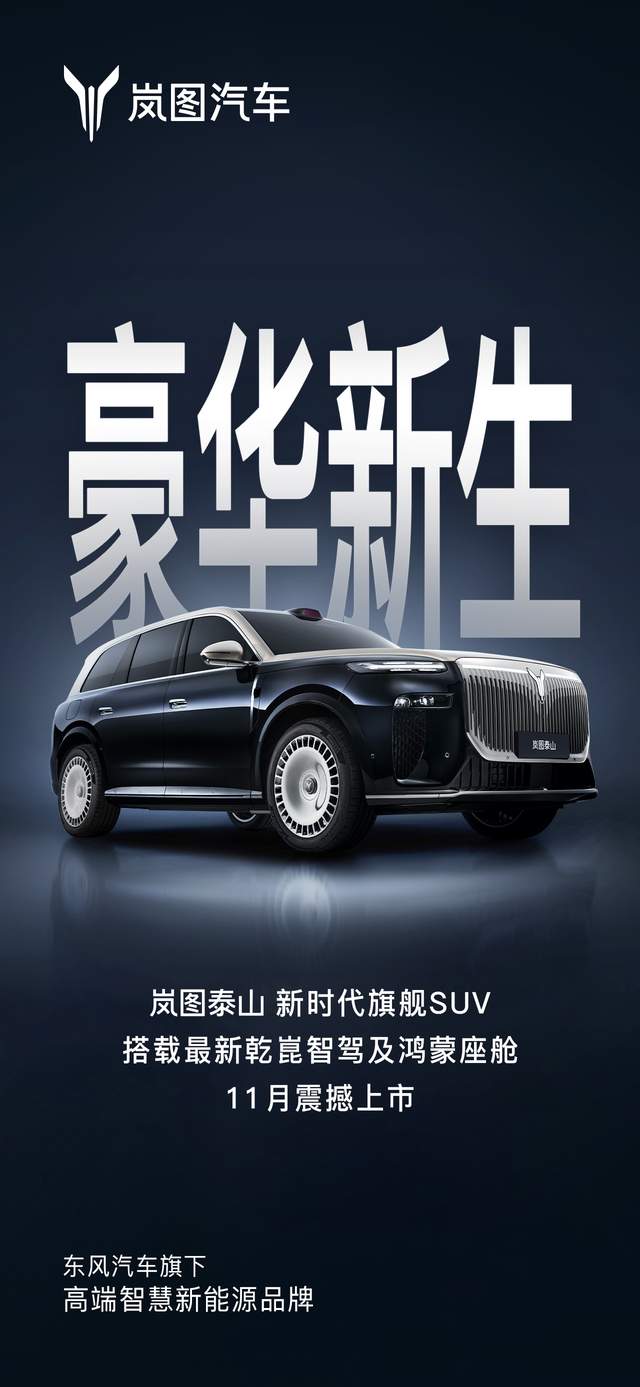 10月20日,岚图汽车对外宣布,旗下首款大六座SUV岚图泰山将于11月正式上市。作为岚图在SUV领域的最新力作,岚图泰山不仅承载着品牌进入50万级豪华市场的雄心,更标志着以岚图为代表的新能源国家队首次推出豪华旗舰车型。