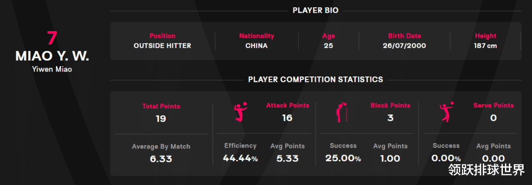 三场小组赛中,缪伊雯合计贡献19分,场均得分达6.3,进攻成功率与拦网效率逐渐提升,特别是在与奥萨斯科一战中,她在关键局展现出果断的进攻选择和快速移动的拦网反应,虽上场时间有限,但仍在有限回合中制造威胁。
