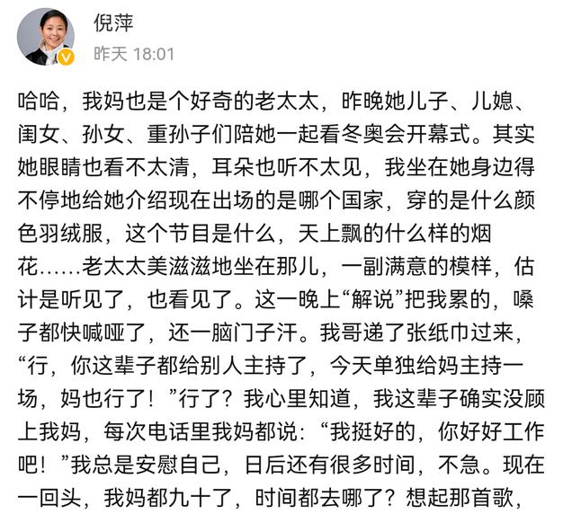老人年龄大了,总是会回忆过去,在加上母亲本就话多,说起来就停不下了,而倪萍没到这时候,就会陪在母亲身边,听着她说话。