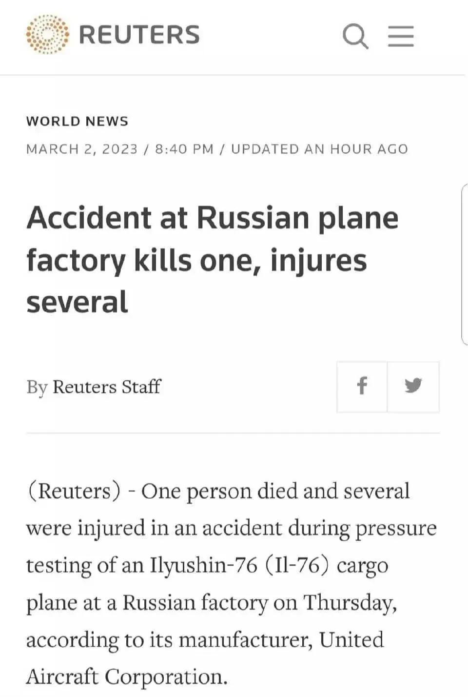 3月2日,路透社报道,俄罗斯乌里扬诺斯克联合飞机制造厂称,周四,一架伊尔-76军用货机在俄罗斯工厂进行压力测试发生爆炸,导致一人死亡,6人受伤。 事故的起因,有关部门在进一步调查,初步排查与人为关系无关。