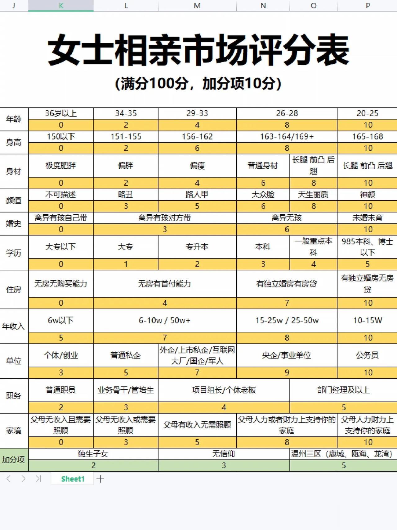 浙江温州,一位专业从事婚恋服务的女子,在网上分享了一份男女相亲市场评分表,挺有意思的,引起了网友的争相评测。 没钱的男士40岁以上就没有市场了,而女士36岁以上也没有竞争优势了。让我没想到的是企业上班打死工的,居然比个体户或者创业单干的人有竞争优势。一个是奔着终身稳定去的,一个是35之前临时的安逸稳定,感觉没有可比性啊,作者是不是笔误了。 有网友说,按上面的表看男士身高评分占的权重最大 ,有点心塞。 也有网友说,但凡是个正常人,都能到90分+,但是身边单身的依然大把。 还有网友说,老公80我73,尼玛这么看我还赚了?不可思议。 @众生百态集 现在相亲市场也这么标准化了嘛,这表一填,条件怎样,是否及格,男女双方是否匹配,在分值上一目了然。一定程度上能节约相亲的成本,避免尴尬场面的出现。