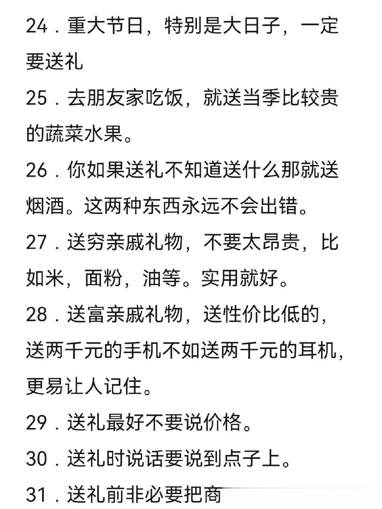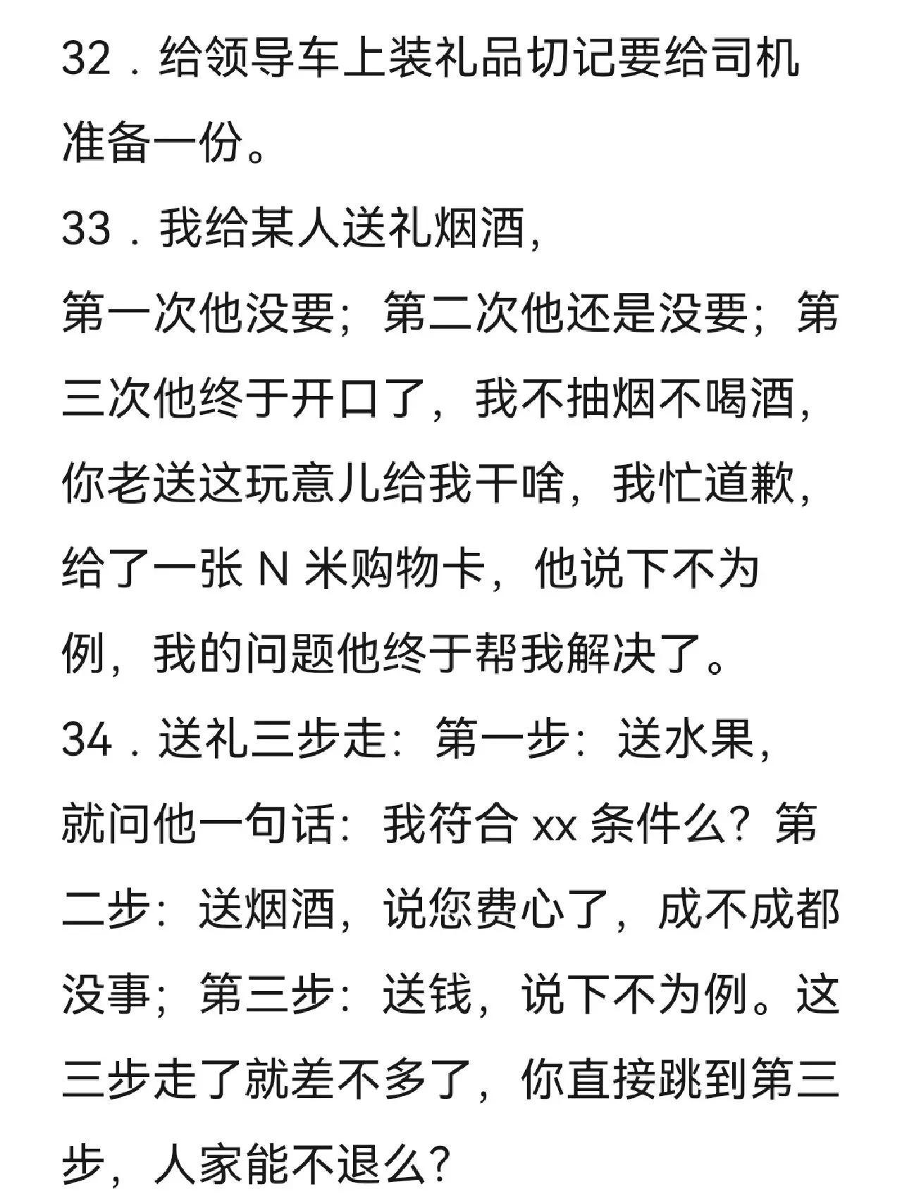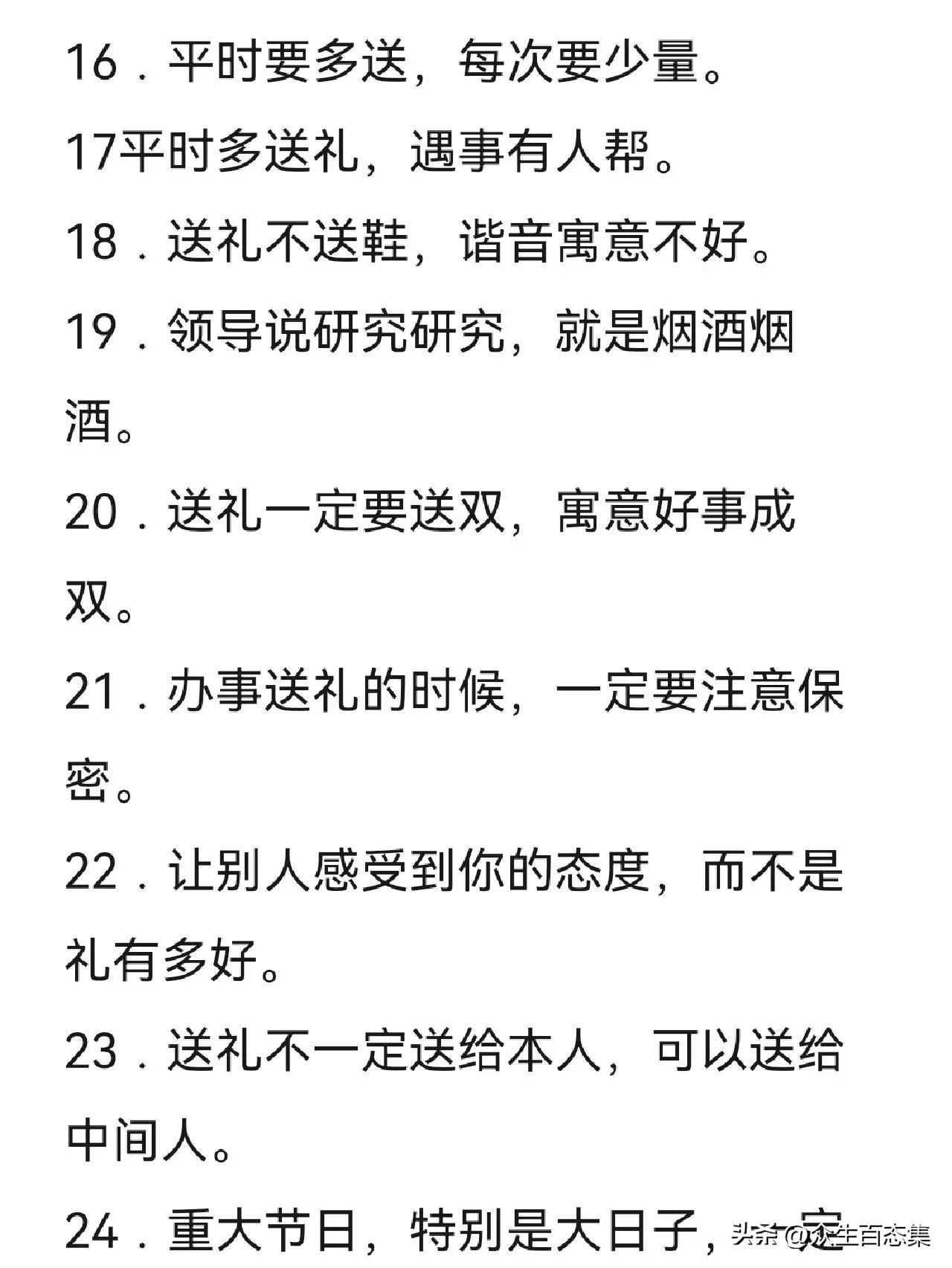 河南开封,一位在江湖摸爬滚打数十年的老炮,在网上分享了35条送礼注意事项,引起了网友们的广泛热议。 原来他说一说到送礼,大家的第一反应都是腐败,不正当竞争,是一种负面行为,不被世俗所接受。然而,那些想办成事的,想往上爬的,都在坚决的执行送礼文化。不说对错,分享35条多年总结的送礼注意事项,多送礼少见面是维持一切感情最有效的方法。 @众生百态集 送礼重要的不是你花了多少钱,而是你用了多少的心思。用钱买别人的经验就是最大的投资。人生最大的失败就是逢年过节不知道该给谁送礼?喜欢烧钱的人都过上了幸福的生活;喜欢送礼的人也过上了幸福的生活。
