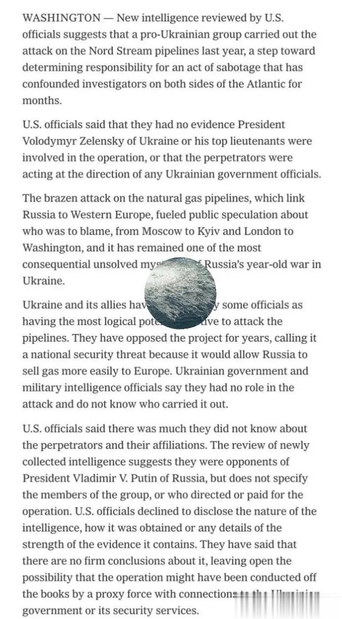 美国官员称,情报显示亲乌克兰组织破坏了北溪输油管道。 华盛顿——美国官员审查的新情报显示,指向去年对北溪管道的袭击是由一个亲乌克兰的组织实施的。并信誓旦旦的声称朝着确定破坏行为的责任迈出了一步。数月来,这起破坏行为一直困扰着大西洋两岸的调查人员。 美国官员表示,他们没有证据表明乌克兰总统弗拉基米尔·泽伦斯基或他的高级副手参与了这次行动,也没有证据表明行凶者是在任何乌克兰政府官员的指示下采取行动的。从莫斯科到基辅,从伦敦到华盛顿,对连接俄罗斯和西欧的天然气管道的无耻攻击,引发了公众对谁该为此负责的猜测,它仍然是俄罗斯在乌克兰长达一年的战争中最重要的未解之谜之一。 在一些官员看来,乌克兰及其盟友拥有攻击管道的最合乎逻辑的潜在动机。他们多年来一直反对该项目,称其对国家安全构成威胁,因为该项目将使俄罗斯更容易向欧洲出售天然气。乌克兰政府和军方情报官员表示,他们没有参与此次袭击,也不知道是谁发动了袭击。 美国官员说,他们对这些肇事者及其所属组织有很多不了解的地方。对新收集到的情报的审查显示,他们是俄罗斯总统弗拉基米尔·普京的反对者,但没有具体说明该组织的成员,也没有说明是谁指挥或资助了这次行动。美国官员拒绝透露这些情报的性质、获取途径以及其中证据的强度。 他们表示,目前还没有确定的结论,这就留下了一种可能性,即这次行动可能是由与政府或其安全部门有联系的代理力量在账外进行的。 北溪管道被炸背后视乎有一只无形的手在操控着,控制着事实真相,能让真相不被披露出来,可见操盘者能量巨大。现在的各种证据是被炮制,还是转移质疑者关注思路,我想随着时间推移会渐渐水落石出。