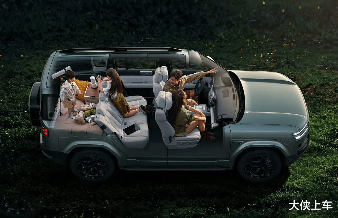 比如除了采用经典的方盒子造型以外,钛7还拥有同级领先的超大尺寸,近5米车长、近2米车宽+70.9%超高得房率,既让整车在视觉上看着方正宽大有型又霸气,又能获得超过3.3m的乘员舱有效车长,这不仅能让身高一米九的成年人在车内也能挺直腰背,还能凭借最大可拓展至1880L的超大后备厢,让座舱秒变大床房或者游乐园,满足女生在聚会、带娃时需要拉装备或者婴儿车等多场景用车需求,堪称大五座天花板!