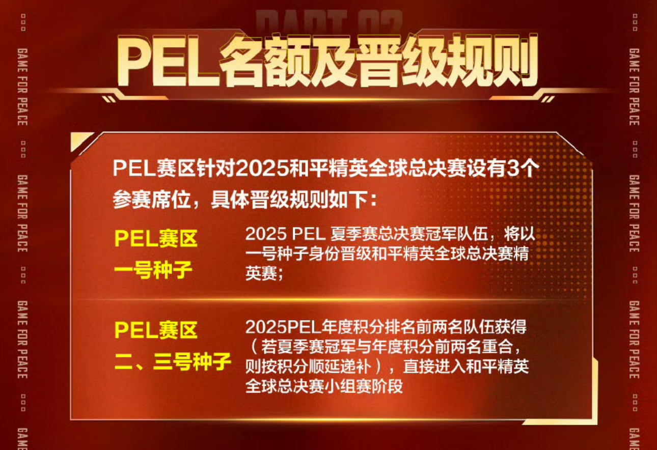 本届夏季总决赛不仅决定冠军归属,更重要的在于还将决定2025和平精英全球总决赛中代表PEL赛区出征的三个名额!依据官方规定,2025 PEL夏季赛总决赛的冠军队伍将以PEL在全球总决赛中的一号种子身份晋级和平精英全球总决赛精英赛,2025 PEL年度积分第一、第二的队伍将分别以PEL在全球总决赛的二、三号种子身份进入小组赛阶段。