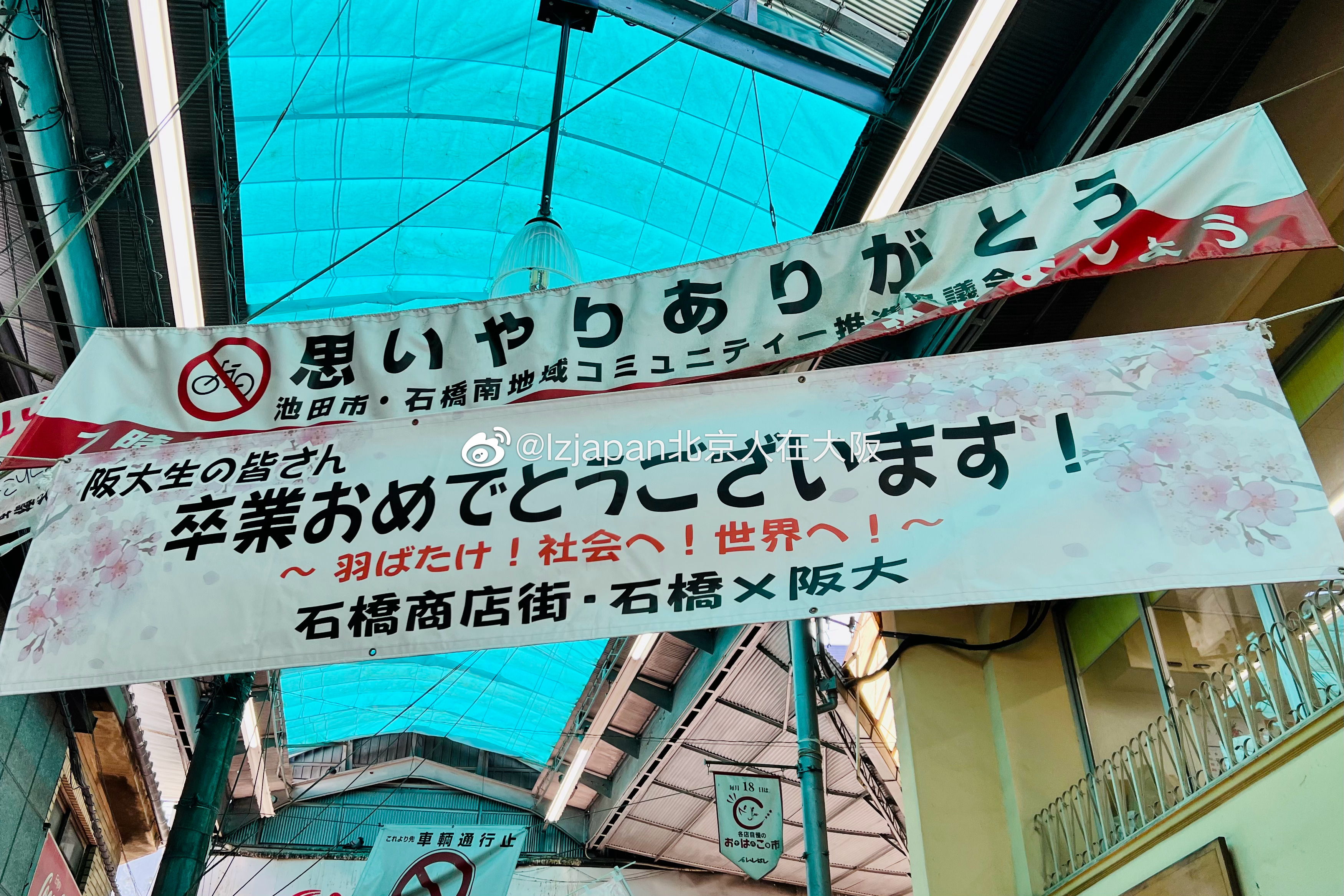 我还看到,阪急电车石桥阪大前车站前的商店街,挂出了横幅庆祝阪大毕业生。希望他们,"展开翅膀勇敢地飞向社会,飞向世界。"让我受到了感动。