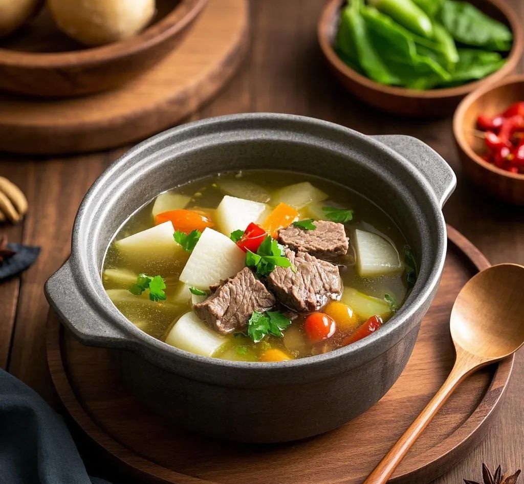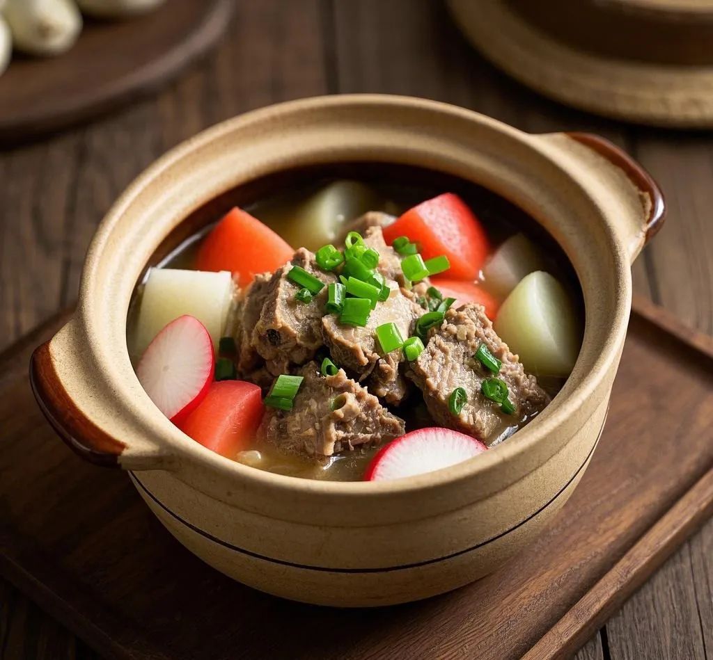 所需材料:新鲜白萝卜1根(约500克),去皮切块、牛肉500克,切块,焯水去血水、生姜3片、葱段2根、盐适量、清水适量