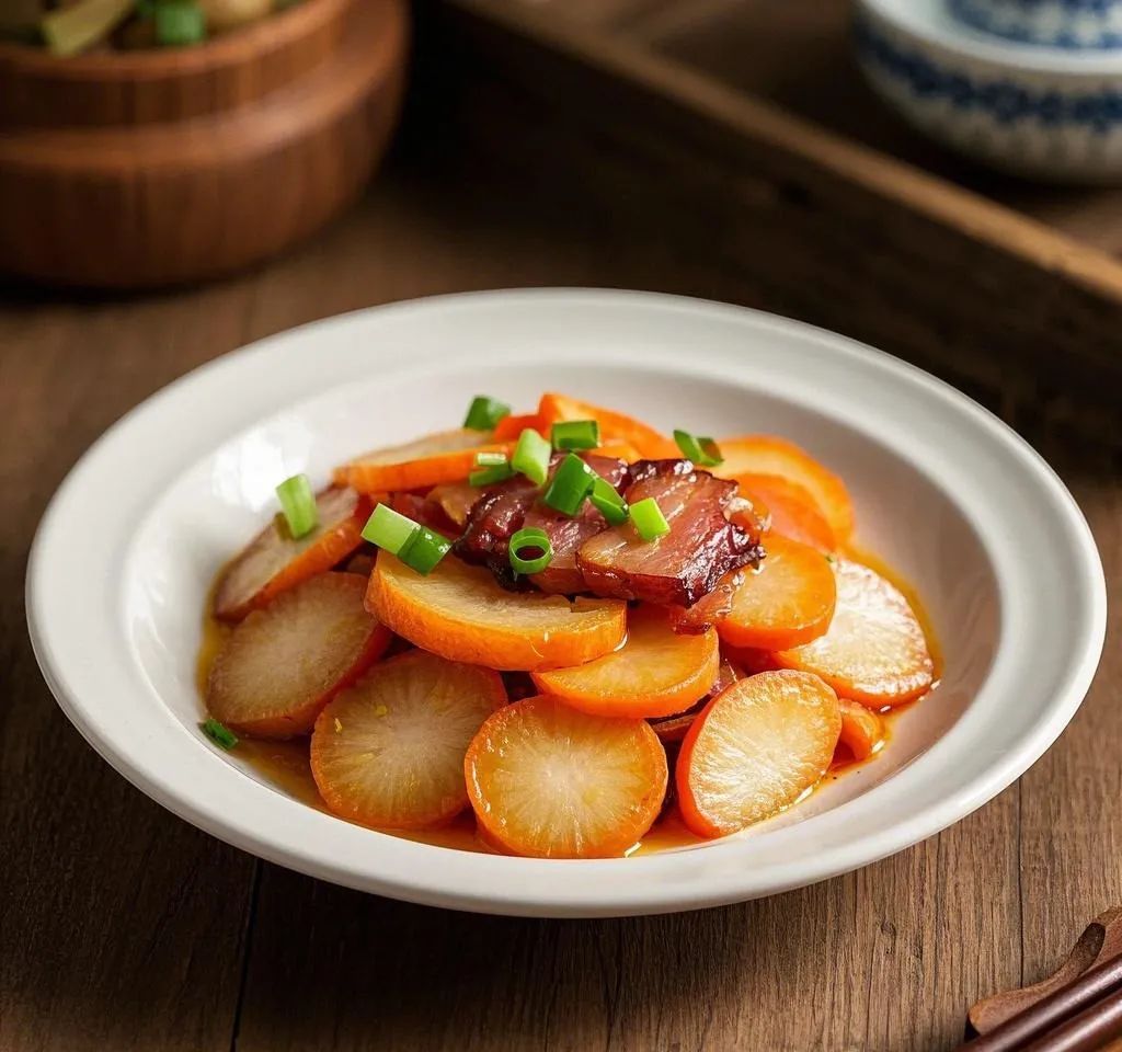 所需材料:腊肉150克,切片、白萝卜1根,去皮切片、青蒜2根,切段、生姜末1汤匙、盐适量、食用油适量